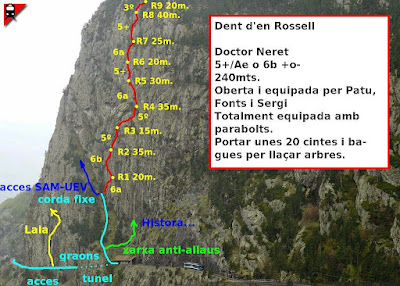 Ja fa un any i picu, Don Angel corria per aquí i vam poder recordar vells temps escalant una altra vegada junts en molts dels nous sectors que hi ha per la comarca. Però no en tenia prou i volia fer alguna via llarga. Com podeu imaginar vàrem anar un dia a Coll Roig , però se li feia petit i volia més metres, així que ens vàrem decidir per anar a fer la via "Doctor Neret" a la Dent d'en Rossell a principis de gener, que gràcies al canvi climàtic només vàrem passar un xic de fred al primer llarg.
