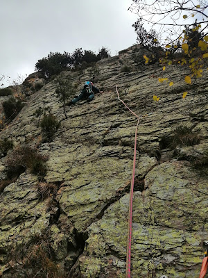 El segon llarg creuem una canal d'herbes molt patinosa. Jo sóc partidari de fer un canvi de reunió, però no el vàrem fer. Jo us ho recomano fer-ho. Després seguim una placa fissurada, fàcil fins a la meitat, on trobem una secció difícil però de bon protegir, en Follet va bufar una mica i el va solucionar ràpidament.