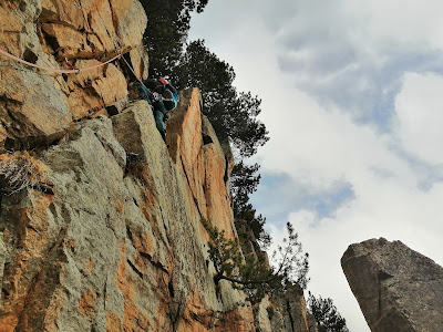 La via en qüestió és "Cordada 25 aniversari", ruta oberta per Marc C. i Josep S. entre el 2019 i el 2021 per commemorar 25é aniversari de l'Associació Excursionista i Ecologista Cordada. La ruta està gairebé equipada i amb uns cinc o sis friends variats i un petit joc de tascons fem de sobres, i per descomptat anells per llaçar arbres. No és un viote, però per paquets com jo està més que bé. Roca sana, excepte el tercer llarg que em de vigilar. Reunions còmodes, i parabolts inoxidables, algun de molt mal posat però n'he vist de pitjors. L'orientació és sud però està a una cota força elevada, 1700/1800 m.s.m. +/-, per tant ens permet escalar-hi molts mesos de l'any.